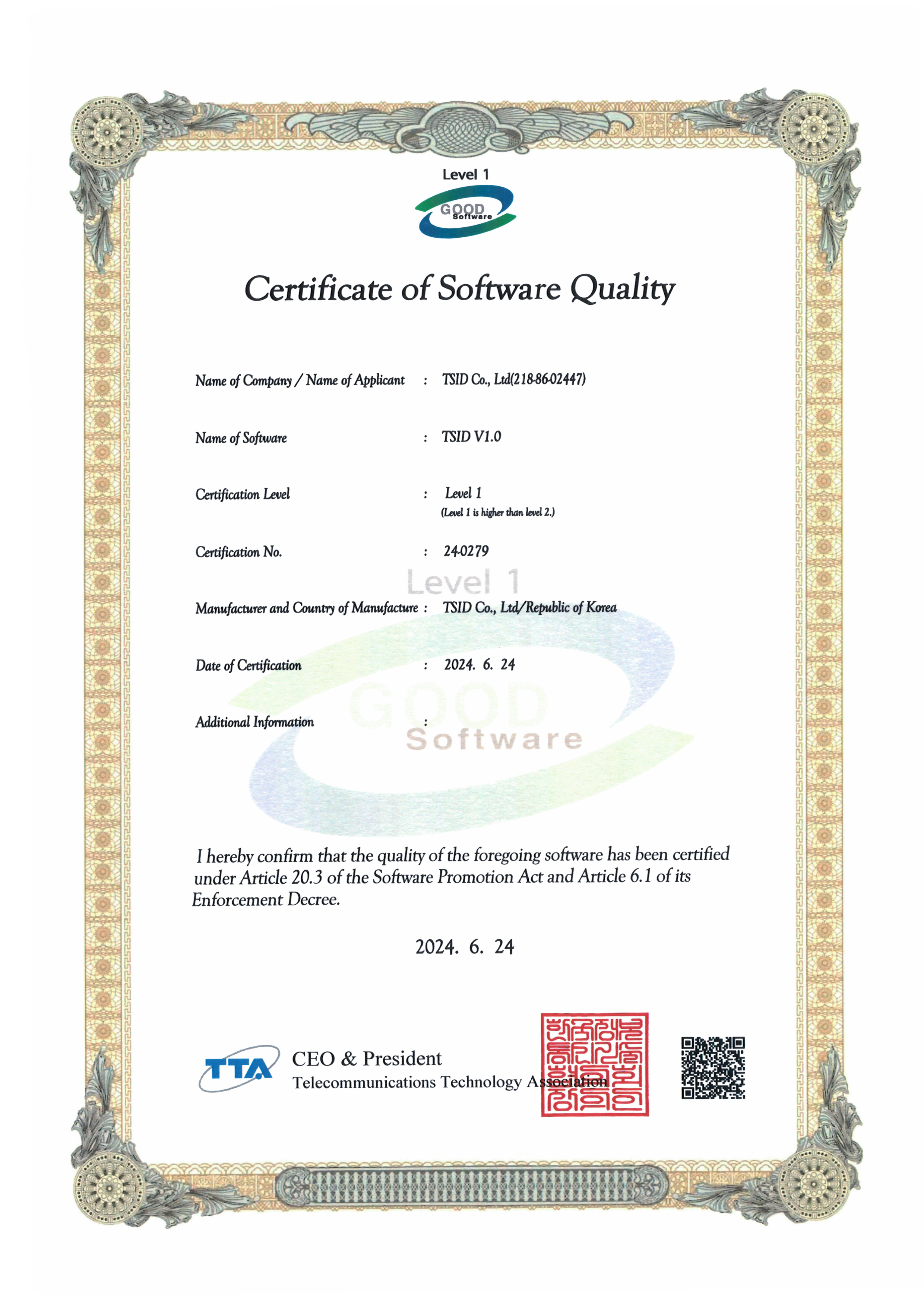 In 2024, TSID was awarded the First-Class GS (Good Software) Certification by the Korea Telecommunications Technology Association (TTA) and successfully passed rigorous international standard testing (ISO/IEC 27001). This recognition validates its potential to transform both industrial security and user convenience on a global scale.